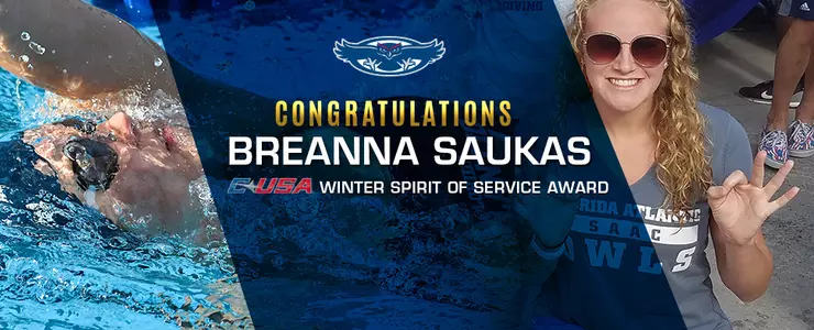 Florida Atlantic University swimmer Breanna Saukas received the Conference USA (C-USA) Winter Spirit of Service Award for her dedication and commitment to academics, athletics and bettering the community as announced by the conference Wednesday.